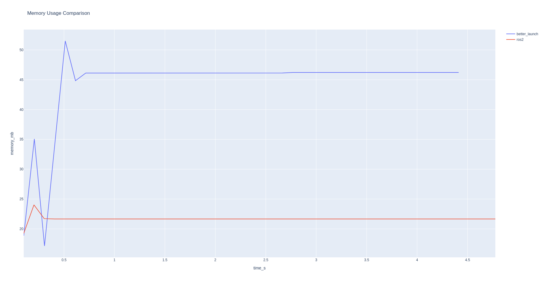 psutil shows that better_launch uses more CPU in the beginning and more memory in total compared to ros2 launch. The memory reported is the unique set size (see the previous link). I'm not sure how these results relate to the memray statistics above.